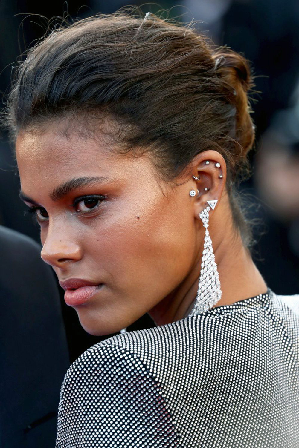 Italian model Tina Kunakey illuminated the red carpet in a pair of Messika high jewellery “Madeleine” earrings. Kunakey, who was accompanied by boyfriend Vincent Cassel, complemented them with Messika’s “Théa” stud earrings.