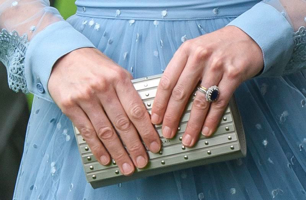 Spotted chatting to royal couples from Spain and the Netherlands, the former Middleton also accessorised with a clutch from Elie Saab. The bag from the designer who has dressed the likes of Angelina Jolie, Halle Berry, Priyanka Chopra and Katy Perry came with brushed metal bands and a leather back. She finished off her monochrome look with silver classic point-toe Gianvito Rossi pumps in metallic nappa, named “Gianvito 105.” Plus, the royal upcycled a pair of Kiki McDonough blue topaz and diamond drop earrings.