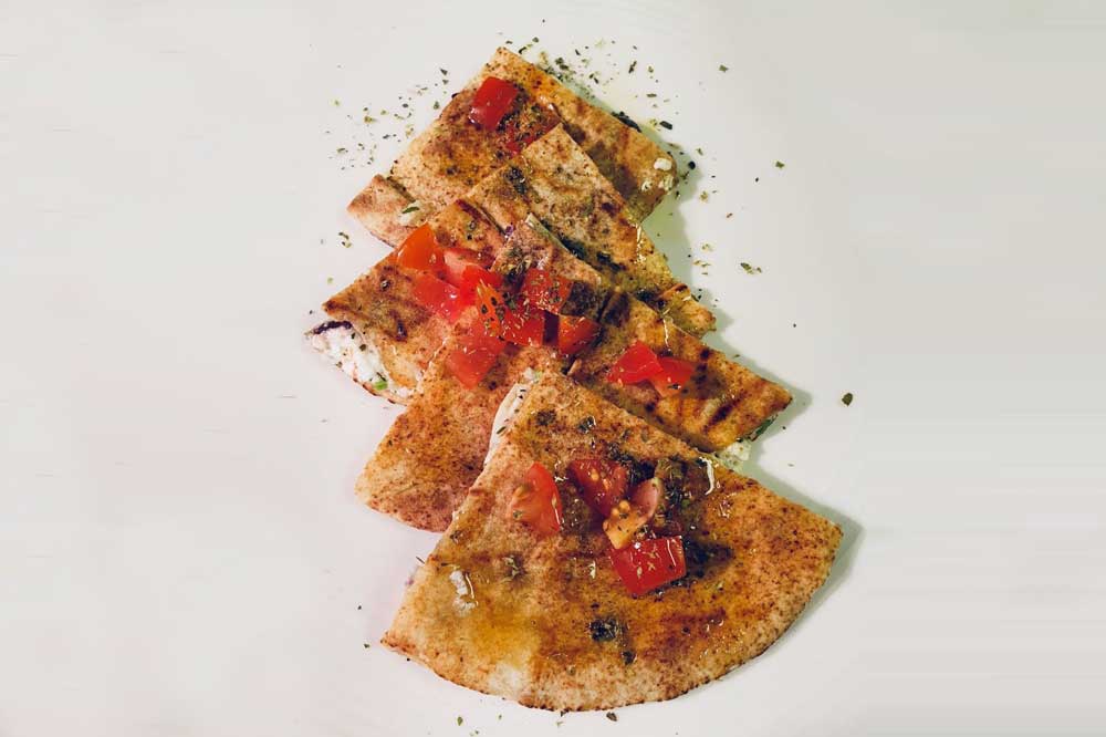 ● Sprinkle the chopped tomatoes on top of the pita and season with salt, olive oil and oregano